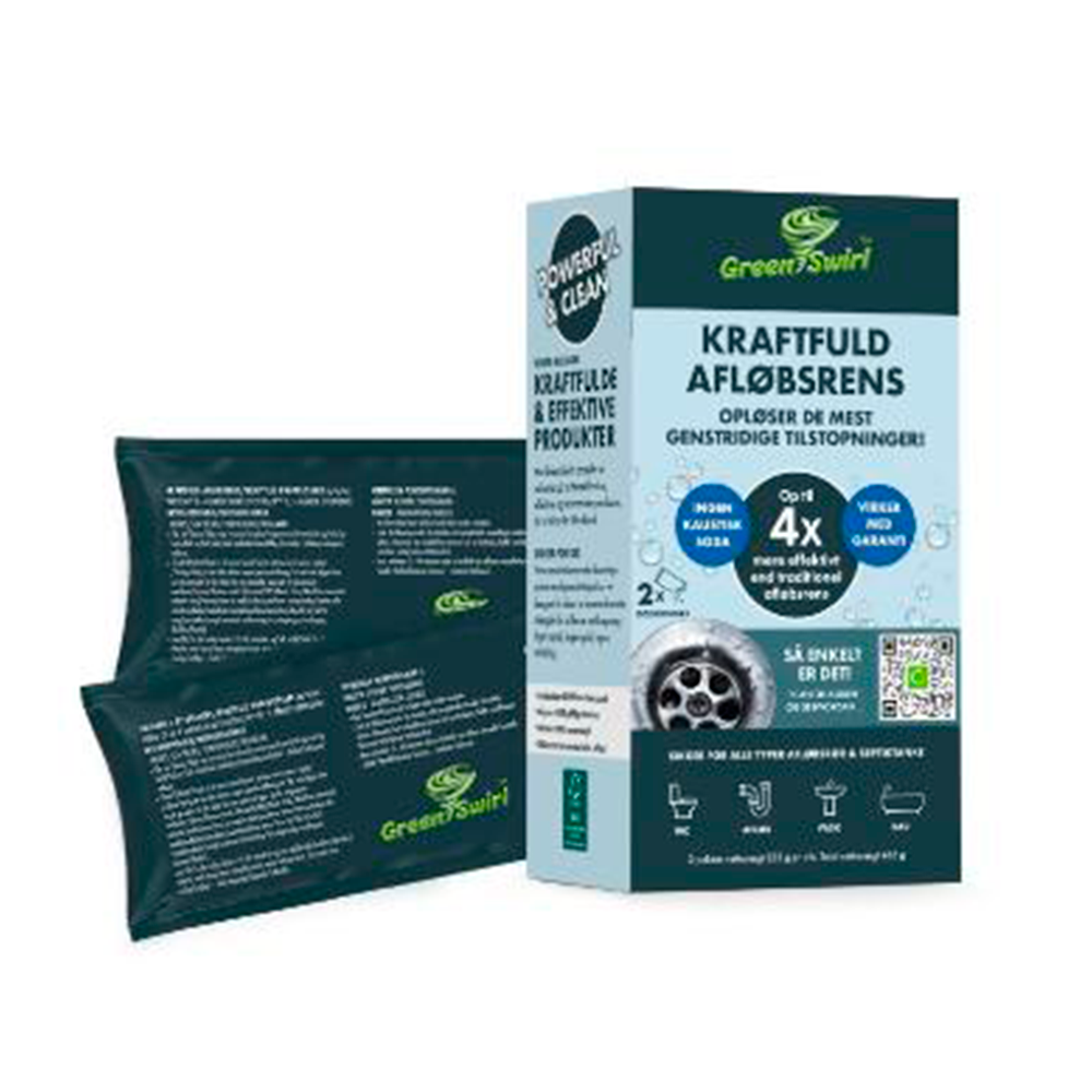 GreenSwirl afløbsrens granulat er udviklet til at opløse genstridige tilstopninger i afløb. Produktet indeholder natriumhydrogensulfat og ikke kaustisk soda, og det leveres i praktiske doseringsposer, som gør påfyldningen mere kontrolleret. Det kan bruges i alle typer afløb og septiktanke og er derfor også relevant til installationer i båd og camping. Sikkerhedsdatabladet klassificerer produktet som alvorligt øjenskadende, så korrekt håndtering og øjenbeskyttelse er vigtig ved brug.