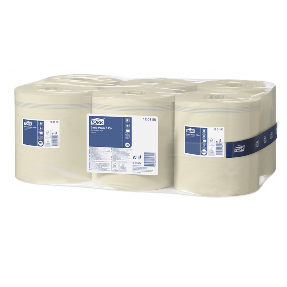 TORK M2 120150 er et 1-lags allround aftørringspapir til håndaftørring og lettere overfladeopgaver. Rullen kan udtages med én hånd og har god vådstyrke, så den egner sig også til glas uden fnug og striber. Pakken rummer 6 ruller i gul farve og passer i TORK M2 centerfeed dispensere.