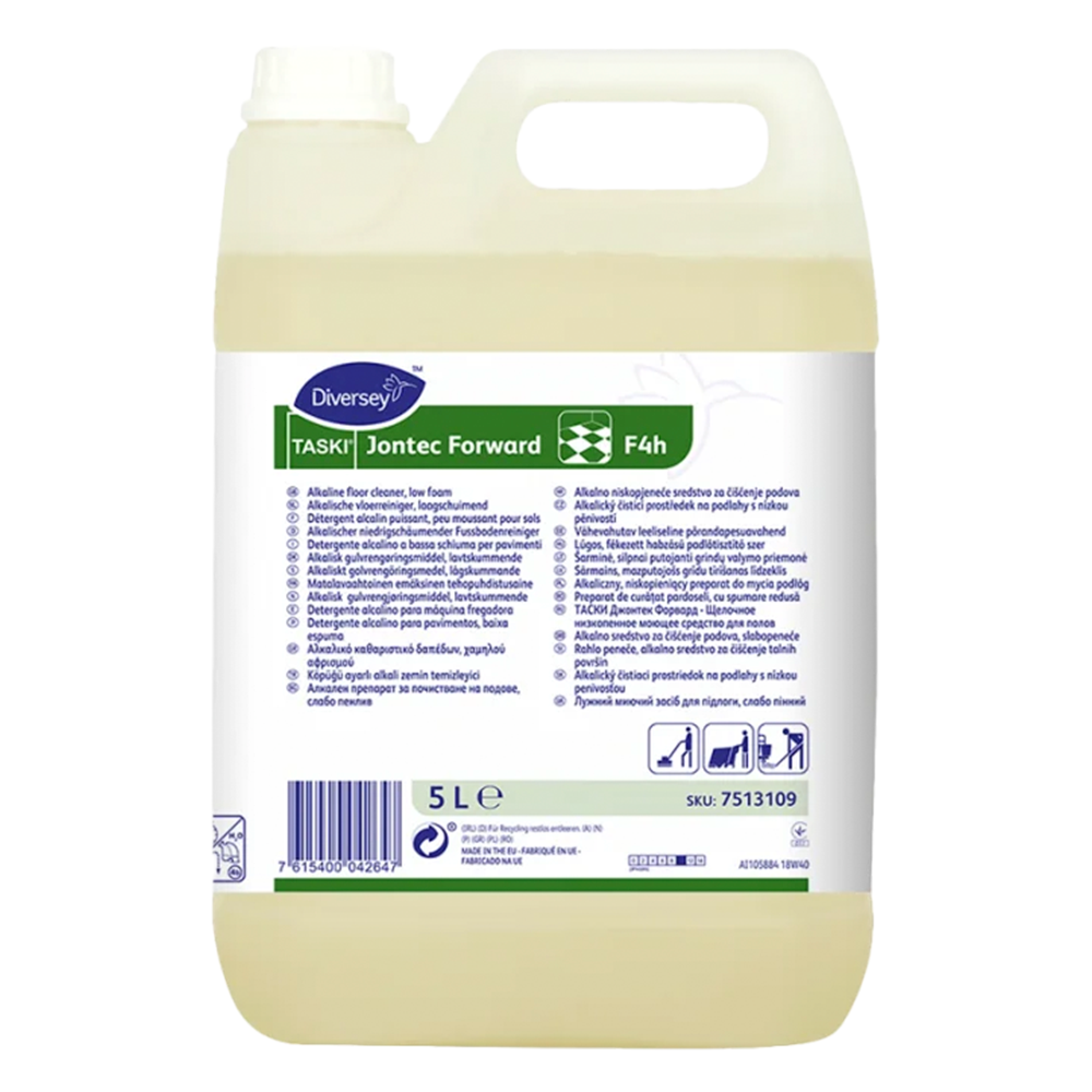 TASKI Jontec Forward F4h er et alkalisk gulvrengøringsmiddel med lav skumdannelse til grundrengøring af gulve, der tåler vand. Det er udviklet til effektiv fjernelse af kraftigt smuds, fedt og vaskeplejefilm og kan bruges i gulvvaskemaskiner, skuremaskiner samt ved manuel gulvvask. Produktet er også velegnet til topskuring af polish før nye lag påføres. Produktbladet angiver, at det ikke må anvendes på vandfølsomme overflader som ubehandlet træ eller kork, og at det har frisk parfume.