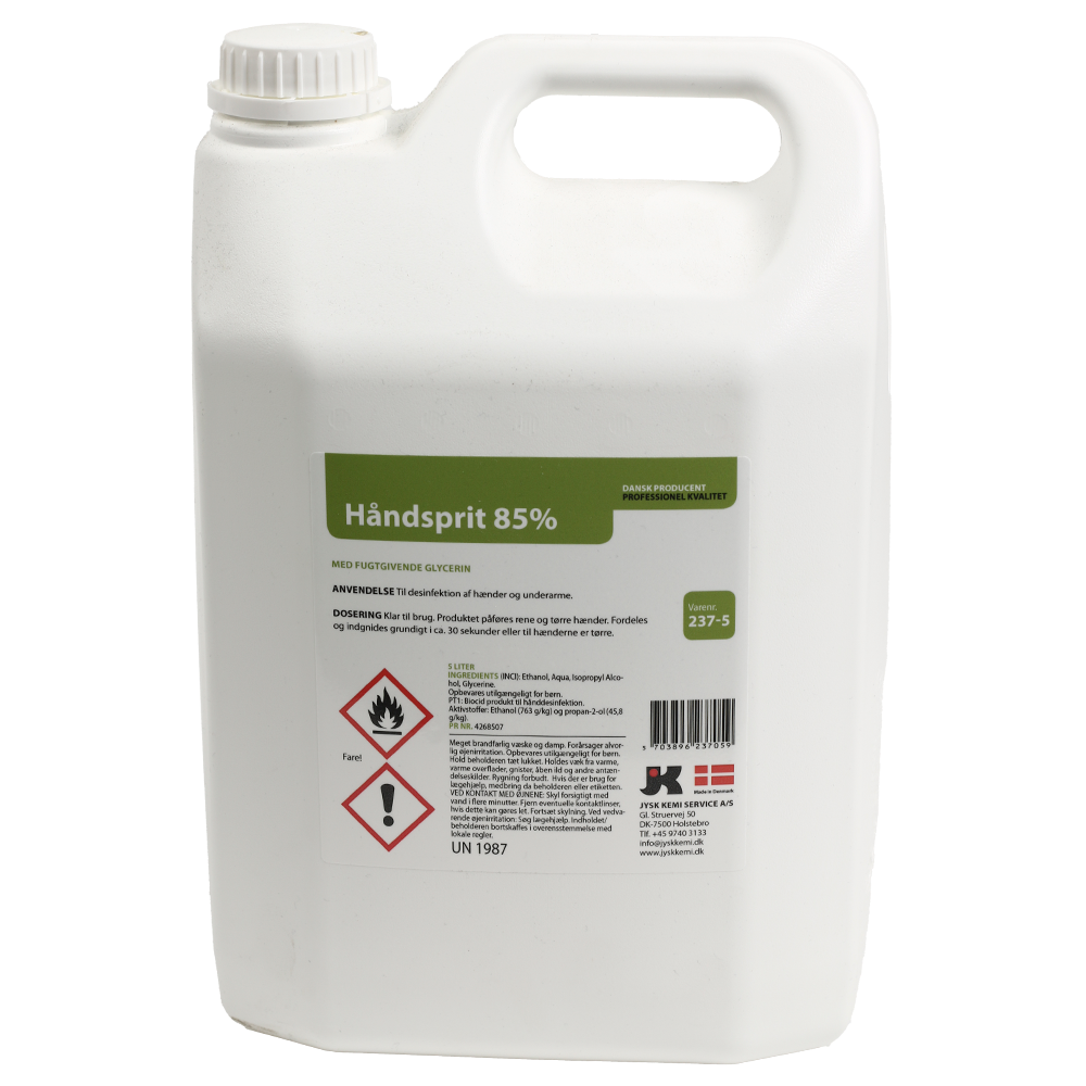 Håndsprit 85 % er en effektiv og klar-til-brug hånddesinfektion til professionel brug. Den anvendes til desinfektion af hænder og underarme og er tilsat glycerin, som virker fugtgivende og reducerer udtørring af huden ved gentagen brug.