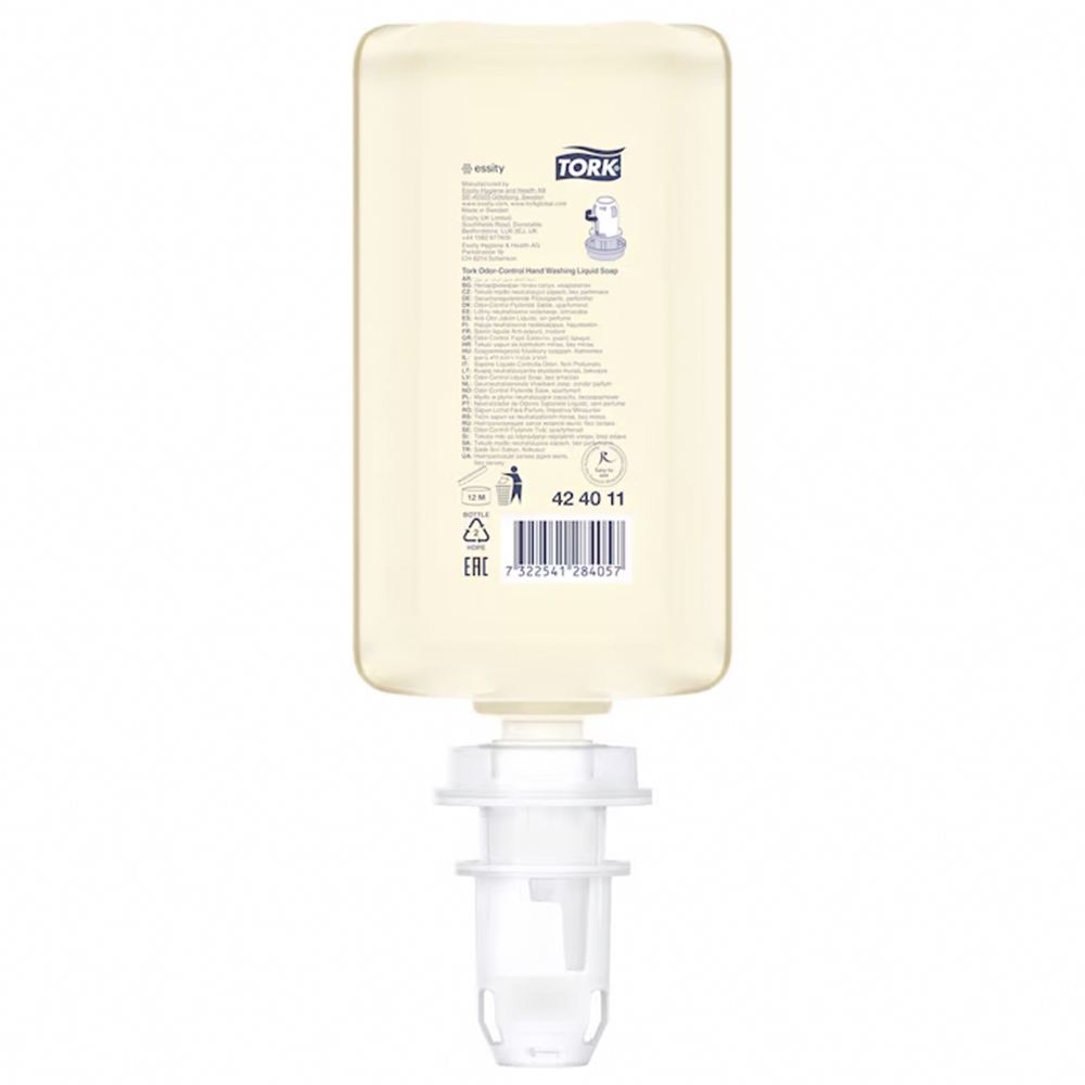 Tork Odor Control er en flydende køkkensæbe uden farve og parfume, formuleret til at hjælpe med at fjerne fedt og madlugt fra hænderne i professionelle køkkener.