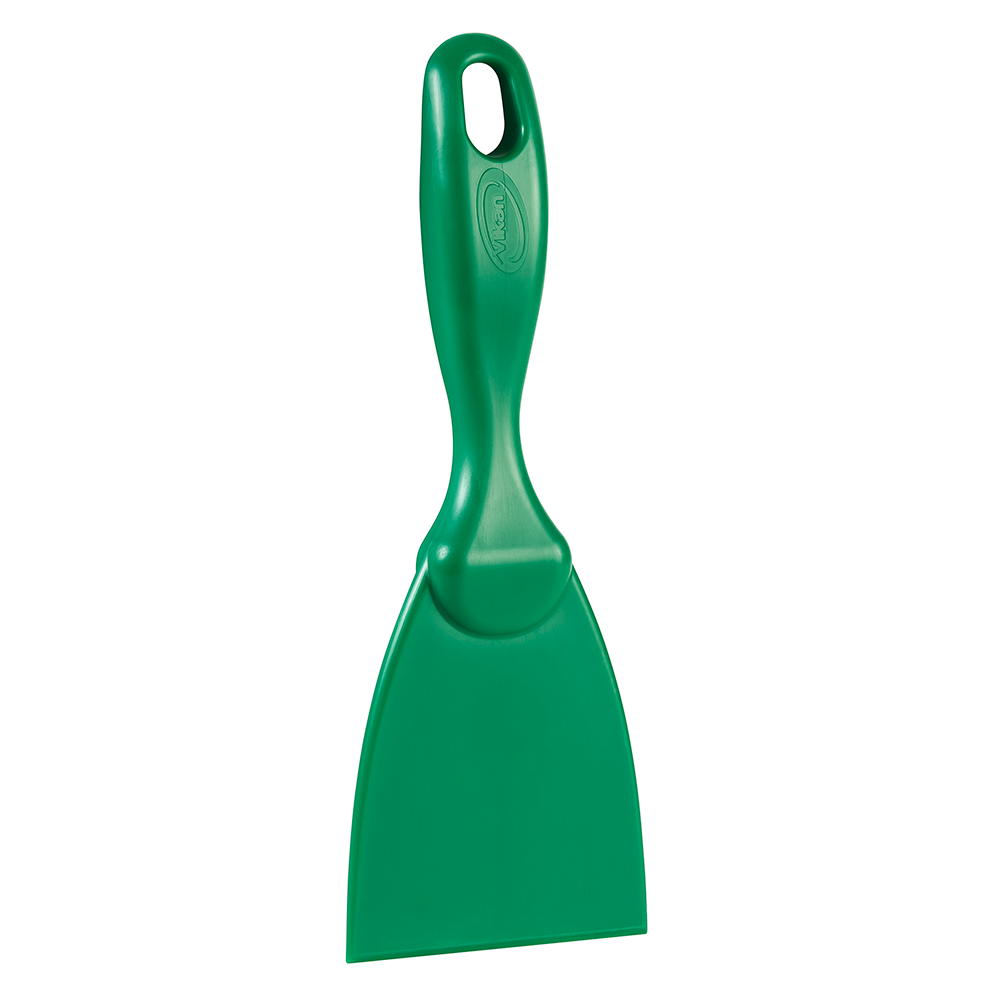 Vikan håndskraber 75 mm er en smal håndskraber til rengøring af små områder og rundt udstyr, fx store skåle. Den er velegnet til at løsne genstridigt snavs som dejrester, chokolade og fastbrændte madrester. Materialet er polypropylen, som reducerer risikoen for at ridse sarte overflader. Fås i to farver, grøn og blå.